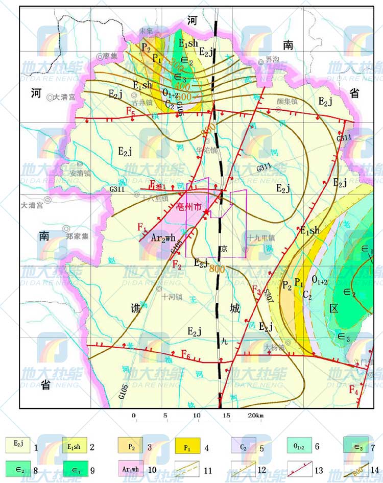 1 古近系界首組;2 古近系雙浮組;3 二疊系上統;4 二疊系下統;5 石炭系上統 ; 6 奧陶系下統和中統;7 寒武系上統;8 寒武系中統;9 寒武系下統;10 五河群;11 實、推測地質界線;12 不整合地質界線;13 斷裂(正斷層);14 松散層(Q+N)等厚線(m)