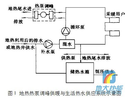 以往計算分析說明[:地?zé)?a href="http://m.bjcywm.com.cn/t/熱泵.html" >熱泵供暖系統(tǒng),以地?zé)峒?a href="http://m.bjcywm.com.cn/t/熱泵.html" >熱泵調(diào)峰供暖方式的供暖成本和投 圖1地?zé)釤岜?/a>調(diào)峰供暖與生活熱水供應(yīng)系統(tǒng)示意圖資低于熱泵單獨(dú)作熱源的供暖方式。