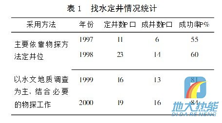 前幾年某單位在水文地質領域剛起步,經(jīng)驗不足,找水主要依靠物探工作,片面追求效率,急于求成,效果很不理想。后來意識到了基巖裂隙水地區(qū)水文地質調查工作的重要性,及時調整了思路,加強了這方面的工作力度,取得了比較好的結果。近幾年來基巖裂隙水地區(qū)定井成功率見表1。