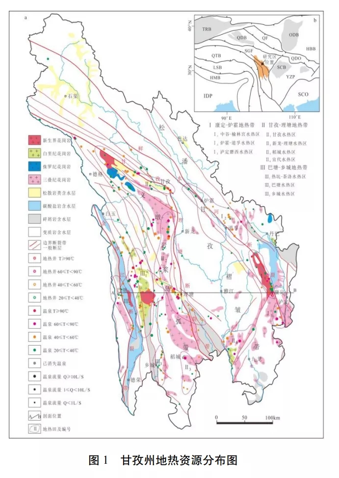 據(jù)最新調(diào)查成果,甘孜州的水熱活動強烈,全州共有溫泉點264 個,地熱井17 口, 除色達縣外,其余17 縣均有水熱活動。 全州溫泉分布主要受 3 條深大斷裂帶和數(shù)條主要大斷裂(德格-鄉(xiāng)城大斷裂帶、玉科大斷裂帶、 陳支大斷裂帶等)控制,形成了3個主要地熱帶和9個水熱活動集中分布區(qū)的基本分布格局。水熱活動強烈區(qū)一般位于主干斷裂帶及其轉(zhuǎn) 折的部位,以康定縣、甘孜縣、理塘縣、巴塘縣 為典型代表。