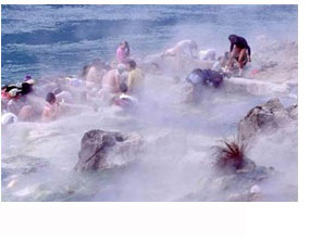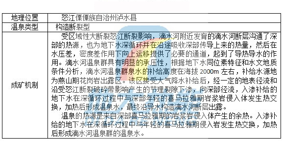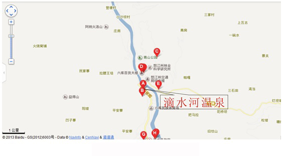 云南滴水河溫泉風(fēng)景滴水河溫泉以泉群形式出露,出水點(diǎn)散布于滴水河河床及河漫灘上,地表為第四系礫石、砂等沖洪積物覆蓋,滴水河溫泉出露特征高程與躍進(jìn)橋溫泉和瑪布河溫泉不同,其出露高程為1502.3m,相對較高。