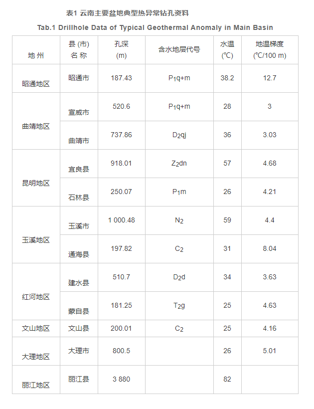 云南中低溫水熱活動區, 主要分布在滇東斷陷盆地中, 水溫相對較低, 但流量大, 共有地熱泉260余處, 地熱鉆孔100多個, 熱泉天然熱流量7.8×104卡/秒, 泉流量4.9米3/秒。以往的勘探成果顯示, 昆明、玉溪、曲靖、昭通、紅河、文山地區的很多盆地中, 都存在有儲量較大的地熱田 (表1) 。